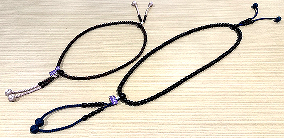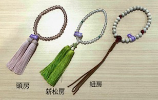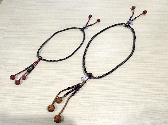 正式には長い一連の数珠を二重にして使いますが、男性は略式の紐房(打紐)の片手数珠が主流です。