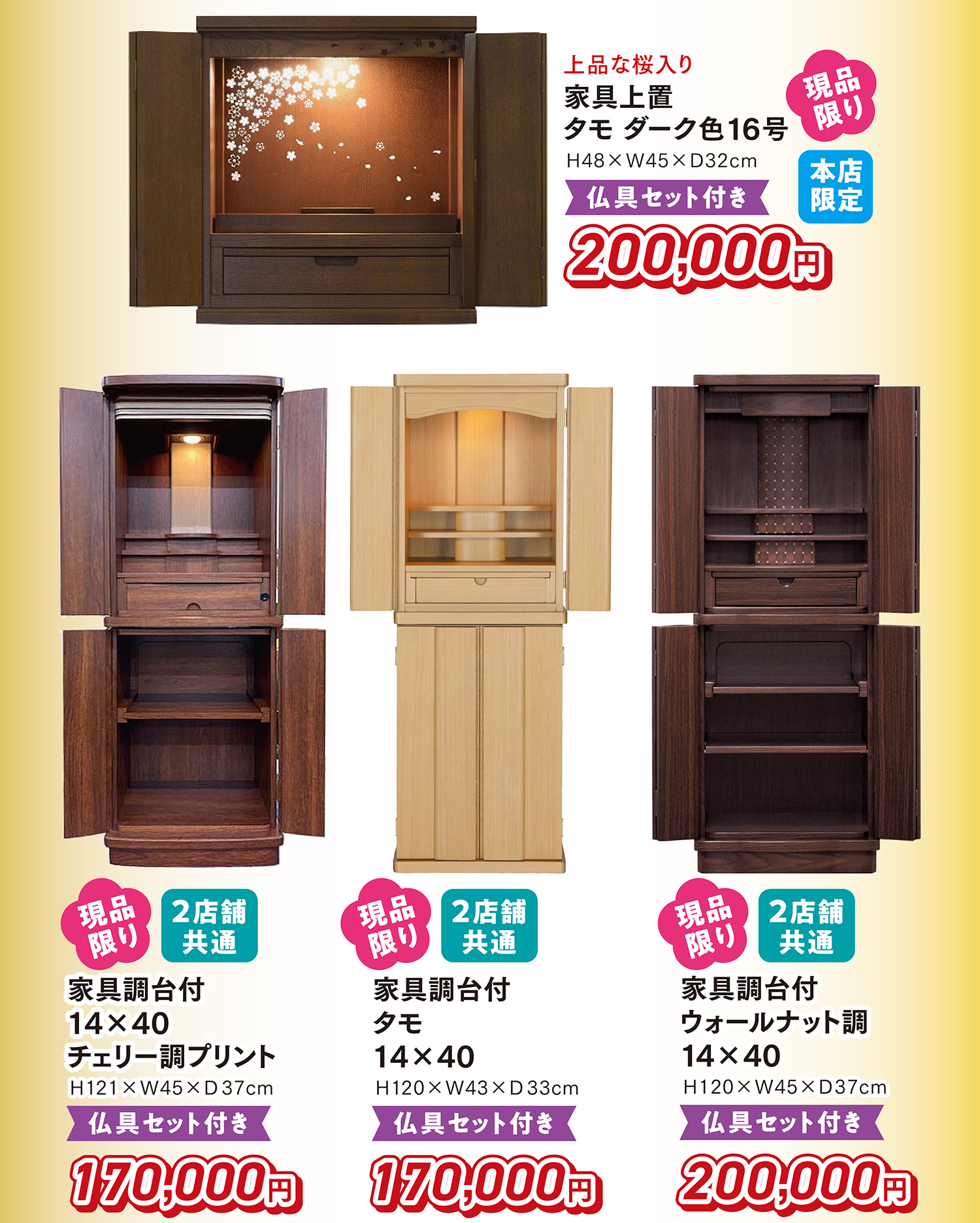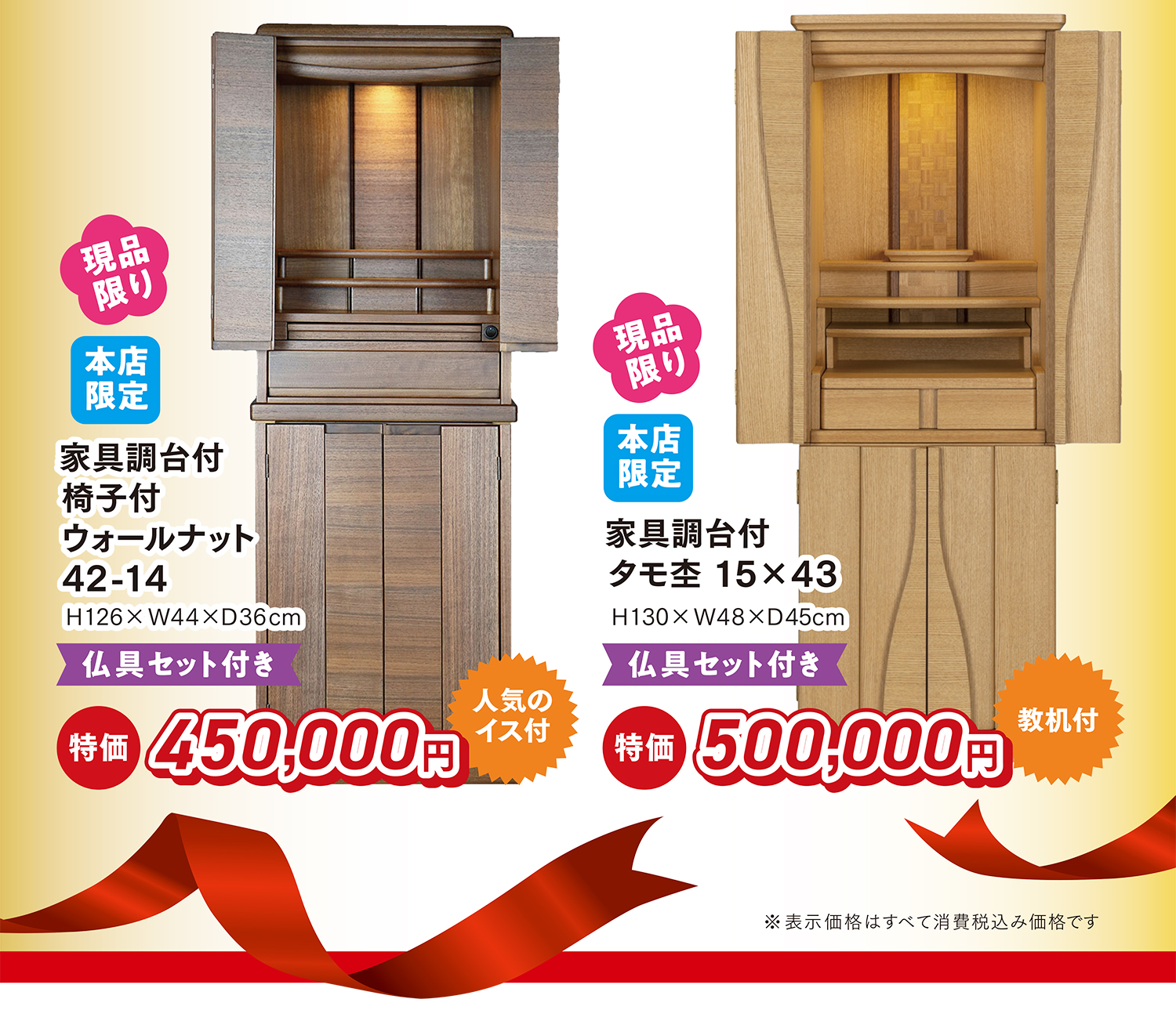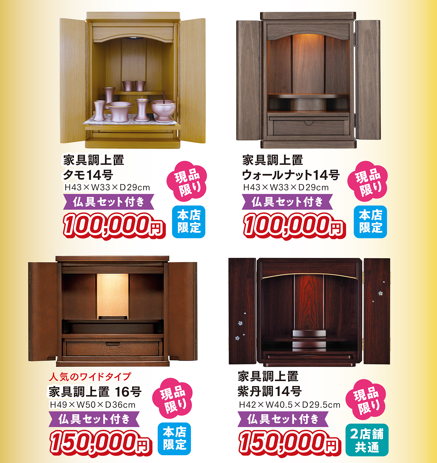 本店限定のワイドタイプの家具調上置仏壇や経机付、椅子付きの家具調台付仏壇など